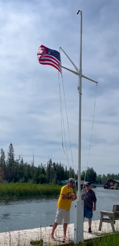 When displaying the U.S. flag on a gaff-rigged flagpole, the flag should be flown from the peak of the gaff, which is the spar extending aft from the mast, not from the top of the mast itself. This positioning is in line with naval traditions where the gaff represents the aft-most point of the vessel and is considered the position of highest honor for the national ensign.