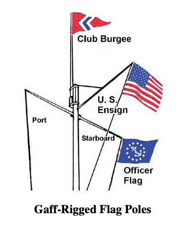 - Yacht Club Etiquette:. This tradition is often applied to yacht club flagpoles, where the gaff-mounted U.S. flag may be lower than the club’s burgee or other flags flown from the masthead.